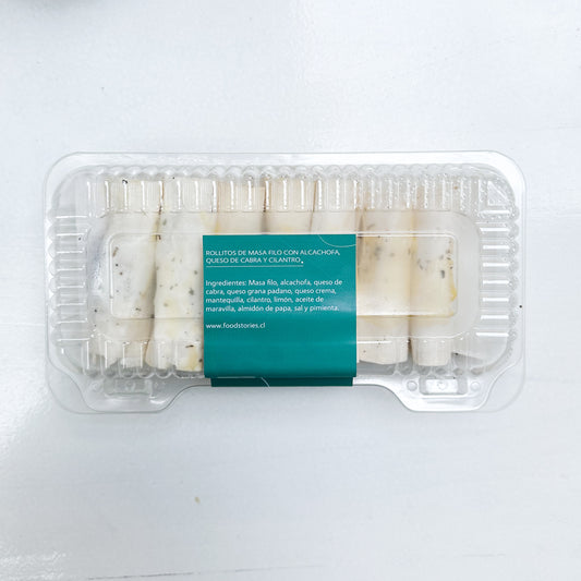 Rollitos de masa filo con alcachofa, queso de cabra y cilantro