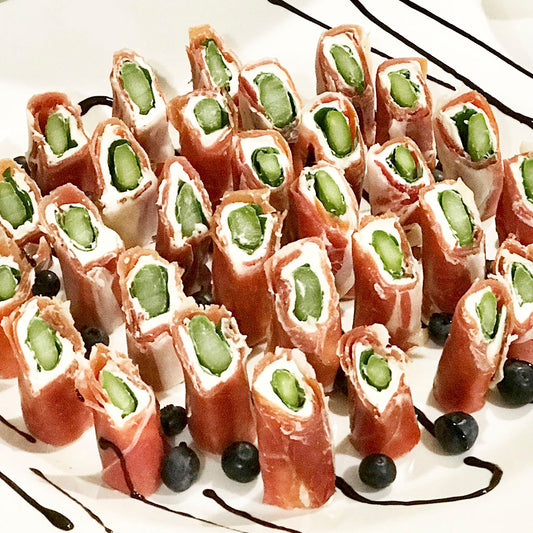 Rollos de jamón serrano con espárragos, queso crema y salsa de moras y Oporto